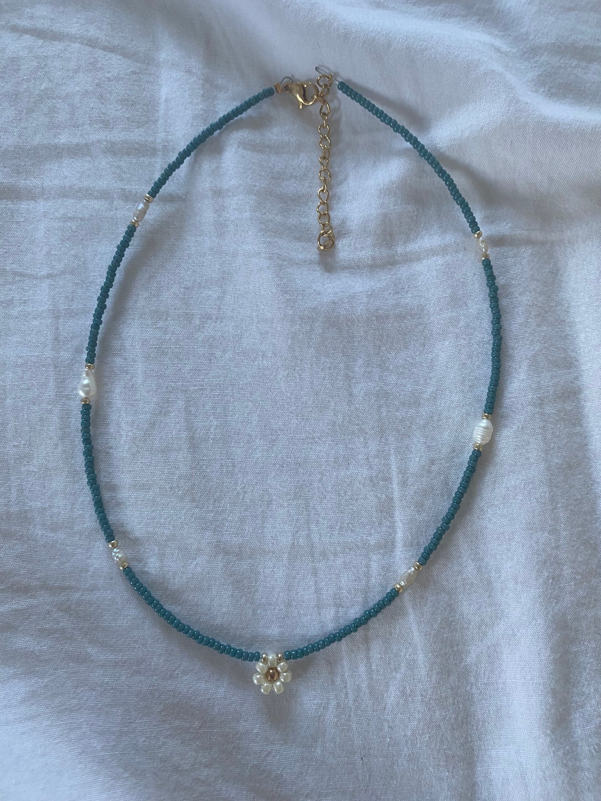 Blue necklace with pearls and flower
